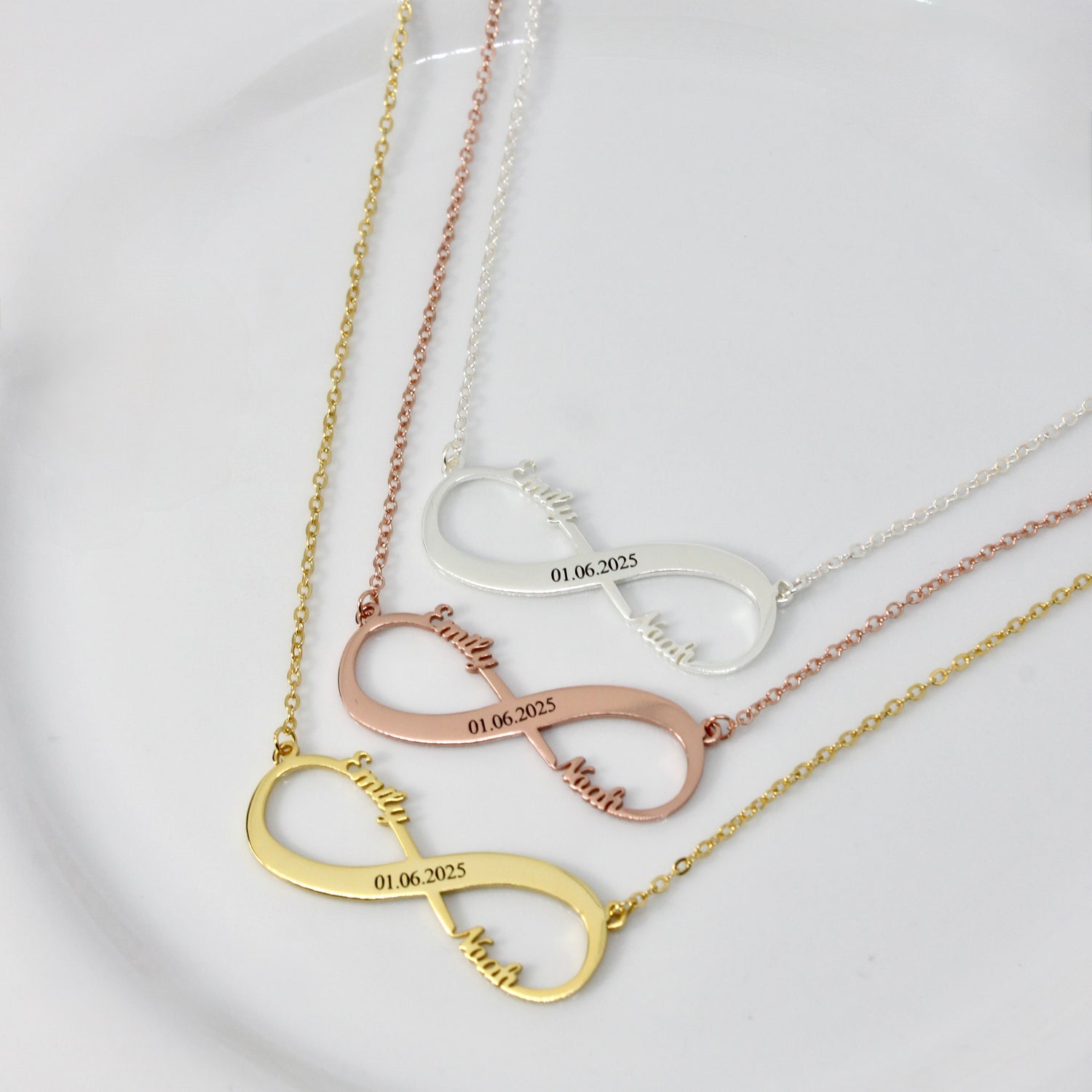 A delicate infinity pendant engraved with two names and one special date. Simple, personal, and made to hold what matters most—love, family, and lasting connection.