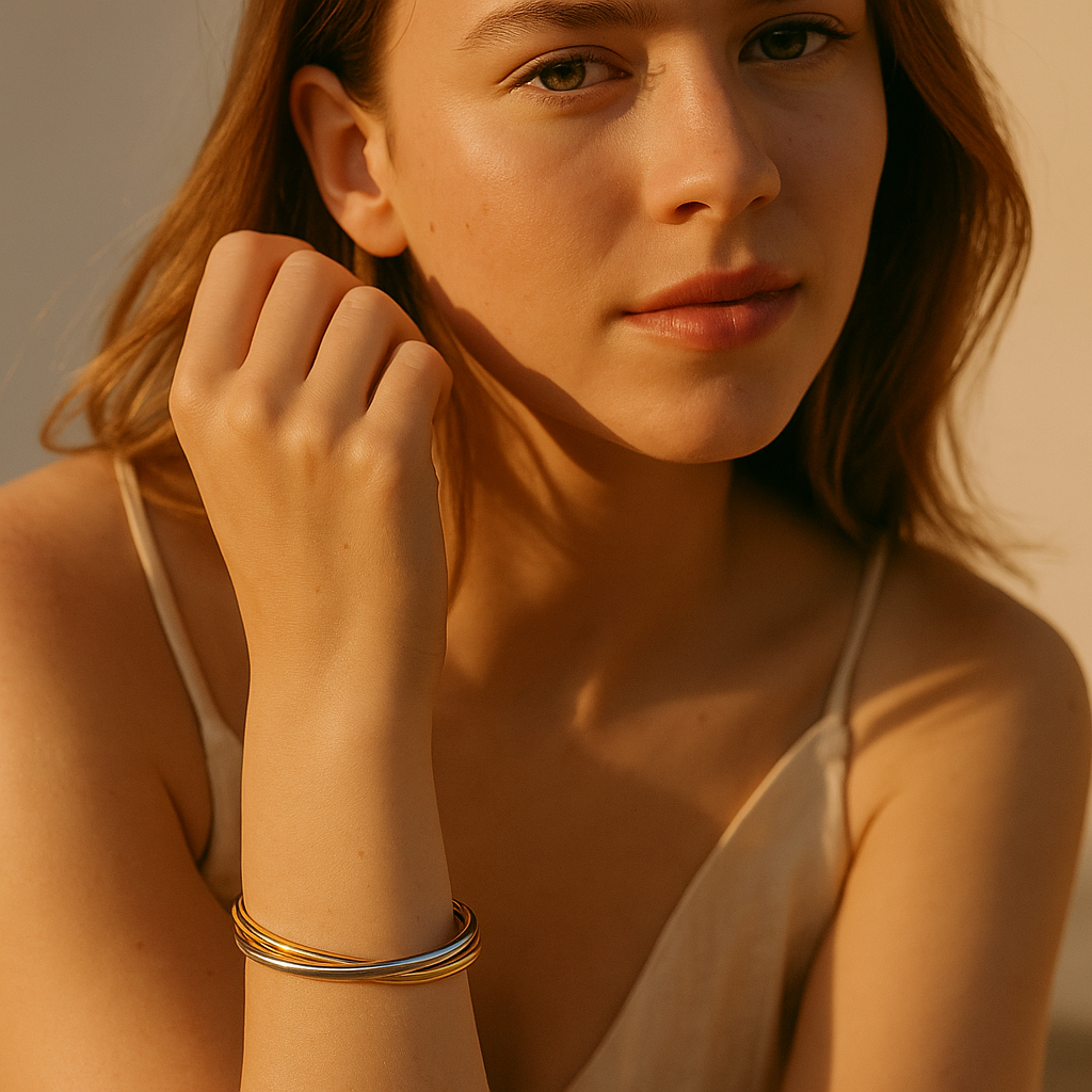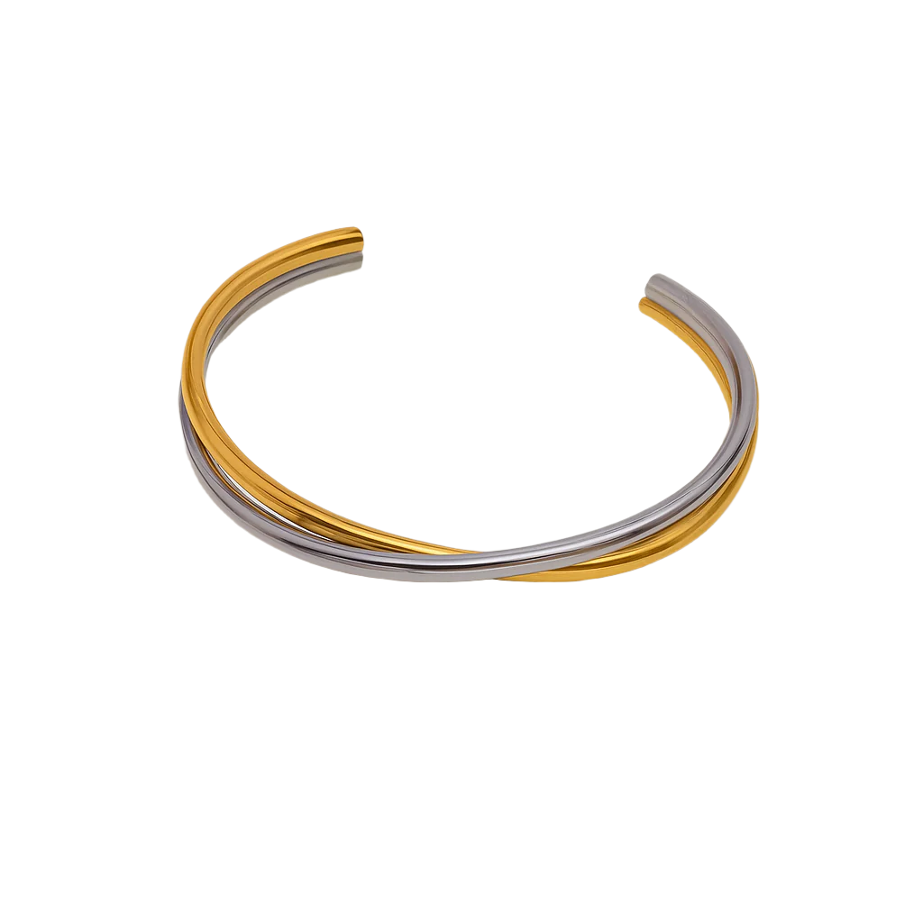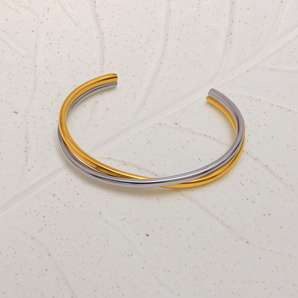 This double bangle features interlocking silver and gold bands that layer effortlessly to create one striking, sculptural look. Light, modern, and made for movement—it's the kind of piece that feels both bold and easy.